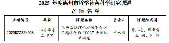 2025年8月12日,中共德州市委宣传部和德州市社会科学界联合会下发了《关于公布2025年度德州市哲学社会科学研究课题立项名单的通知》。我院教师傅永梅主持的《生态系统理论视域下青少年越轨行为“FSC”干预体系研究》课题获批立项。该项目从生态系统理论出发,构建面向青少年越轨行为的“FSC”综合干预体系,旨在通过多层次协同治理提升青少年行为健康水平,契合德州社会治理和未成年人保护的重点需求。