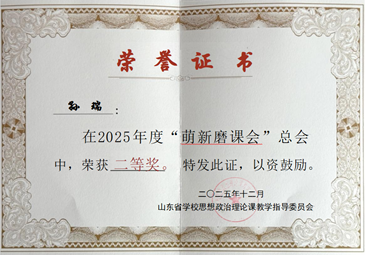 本次“萌新磨课总会”由省教育厅指导,山东省学校思政课教学指导委员会、山东省大中小学思政课一体化建设指导中心等联合主办,作为全省思政课教学领域的高水平交流平台,吸引了全省百余所高校的青年教师参赛。孙瑞老师凭借扎实的理论功底、创新的教学设计和生动的现场展示脱颖而出,备赛期间,学校高度重视,马克思主义学院组建专项指导团队,通过多轮集体打磨和模拟演练,助力孙瑞老师打造兼具思想性与感染力的思政课堂,最终荣获二等奖。